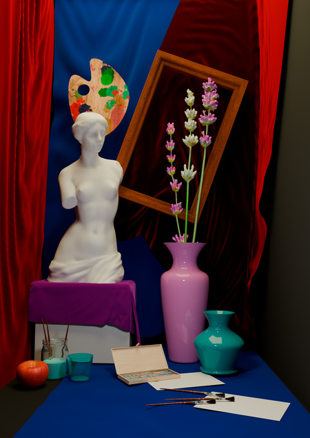 Невская палитра — российский завод профессиональных художественных красок, их акварель «Белые ночи» имеет огромную популярность среди художников. Именно «Белые ночи» чаще всего рекомендуют использовать в художественных школах и училищах, этот факт и помог мне придумать концепцию витрины. При создании композиции я отталкивалась от классических натюрмортов из «художки».