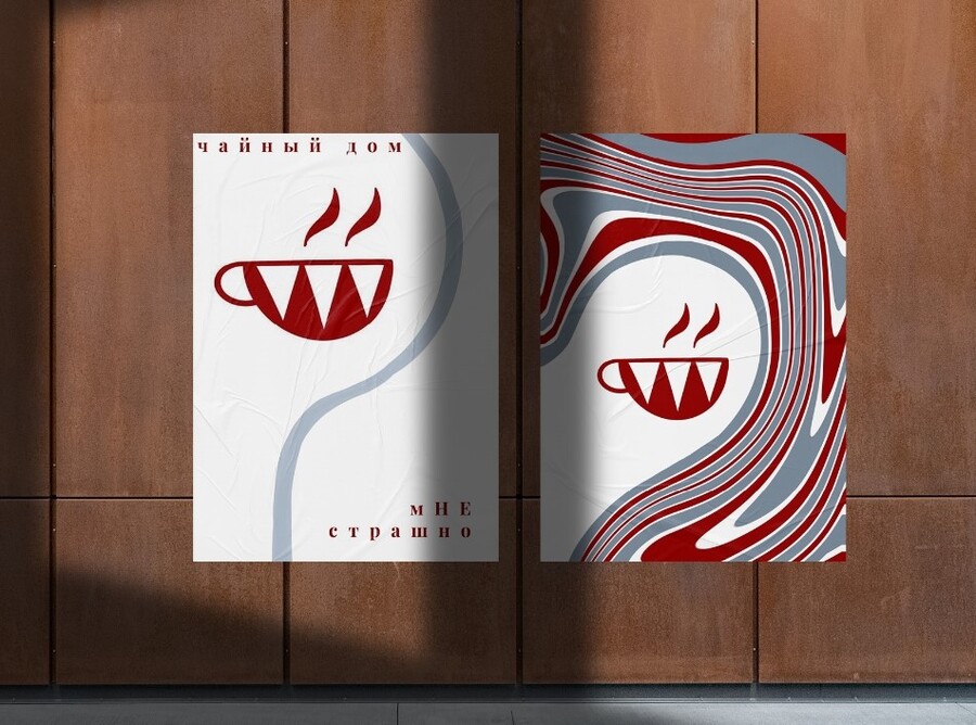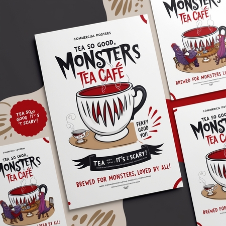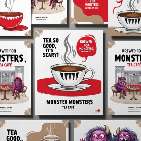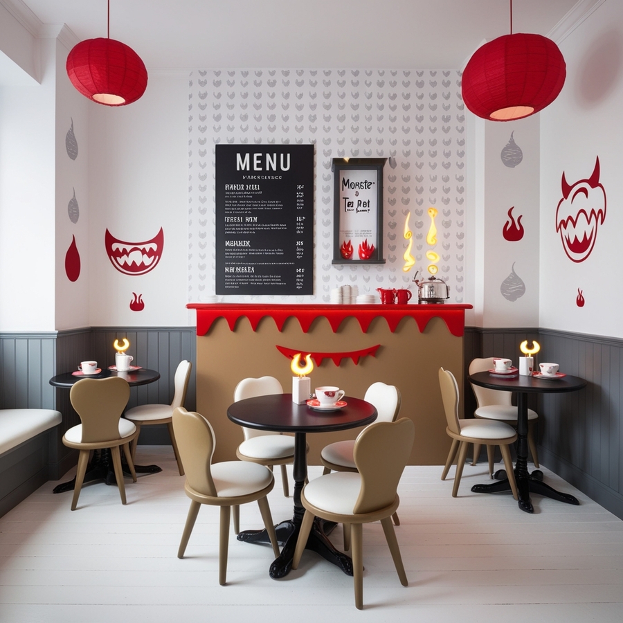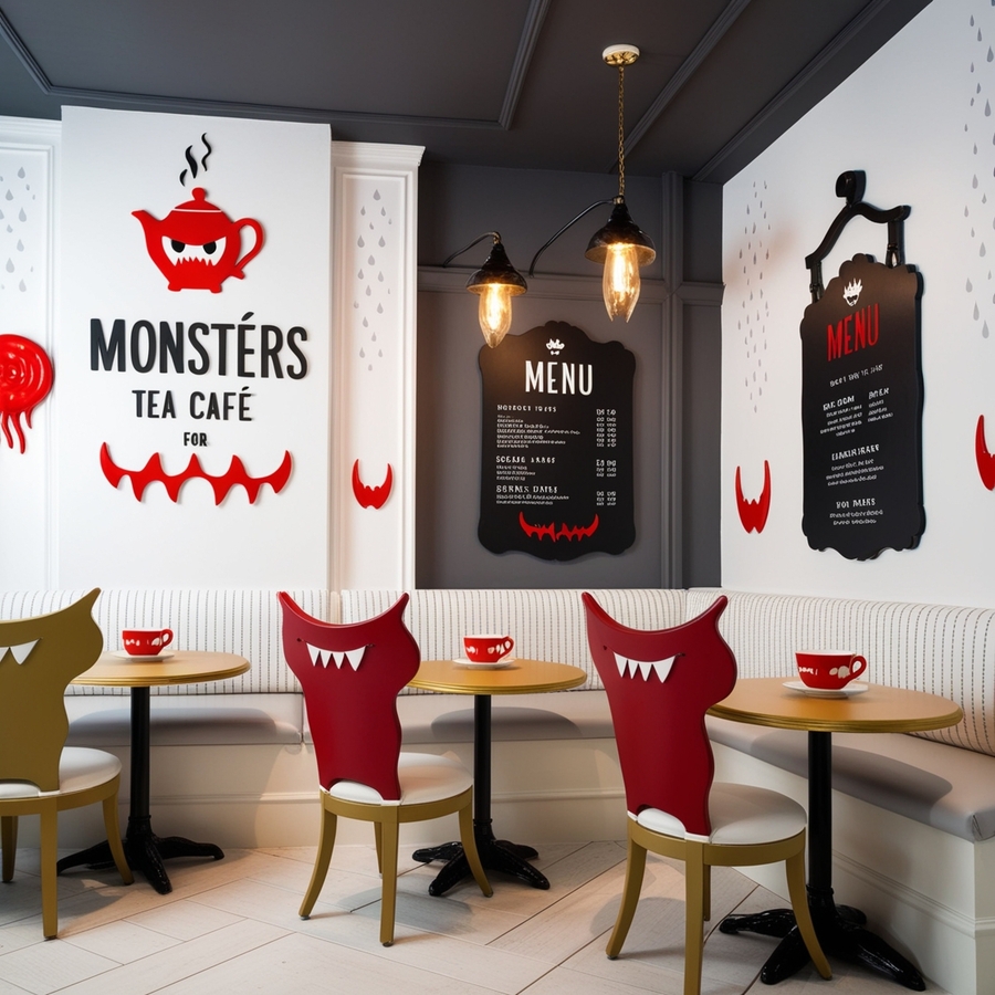 Промпт для интерьера: A whimsical tea café designed for monsters, featuring a bright and inviting yet eerie atmosphere. The café's interior and branding are based on a primarily white color palette, with deep red as a striking accent, complemented by soft gray and charcoal black for details. The walls are predominantly white, with subtle gray patterns and occasional red fang-like motifs for emphasis. Furniture includes claw-foot tables and chairs with backs shaped like monster teeth, painted in muted tan with white upholstery. Deep red appears as highlights on teacups, signage, and decorative elements like glowing steam-shaped lights and red claw marks on the tan counter. The menu board, in charcoal black with crisp white handwritten-style text, stands out against the light backdrop. Playful details, such as teacups with small red fang accents, complete the quirky, inviting yet eerie monster café design.» Posters «Eye-catching commercial posters for a whimsical monster-themed tea café. The design features a clean white background with bold red accents to create a striking, modern aesthetic.