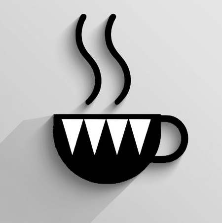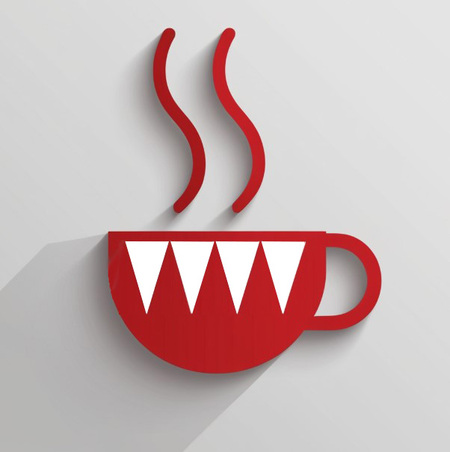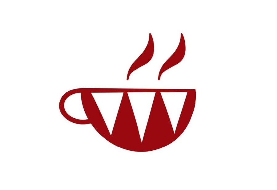 Промпт для Логотипа: A minimalist logo featuring a red coffee cup in one color no shadows with a handle on the left side, designed in a flat, modern style. The cup has a pattern of sharp, white triangular shapes along its body, resembling teeth. Above the cup, there are two simple, curved red steam lines indicating heat. The background is plain white, enhancing the bold red and white contrast.