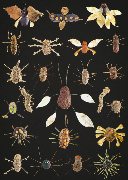 In this project, I create insect cryptides from the dead. I go into the woods and collect fallen leaves, branches, bumps, feathers. Then I bring it all home and turn it into powder. That’s why I use the hammer and the foot. It’s a sort of ritual in which natural objects make a transition — they become cryptides.