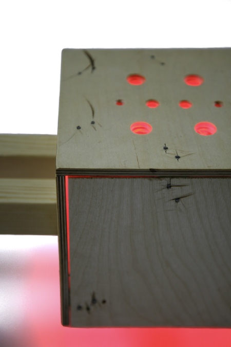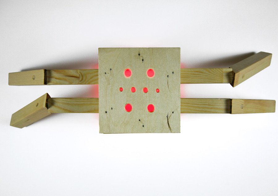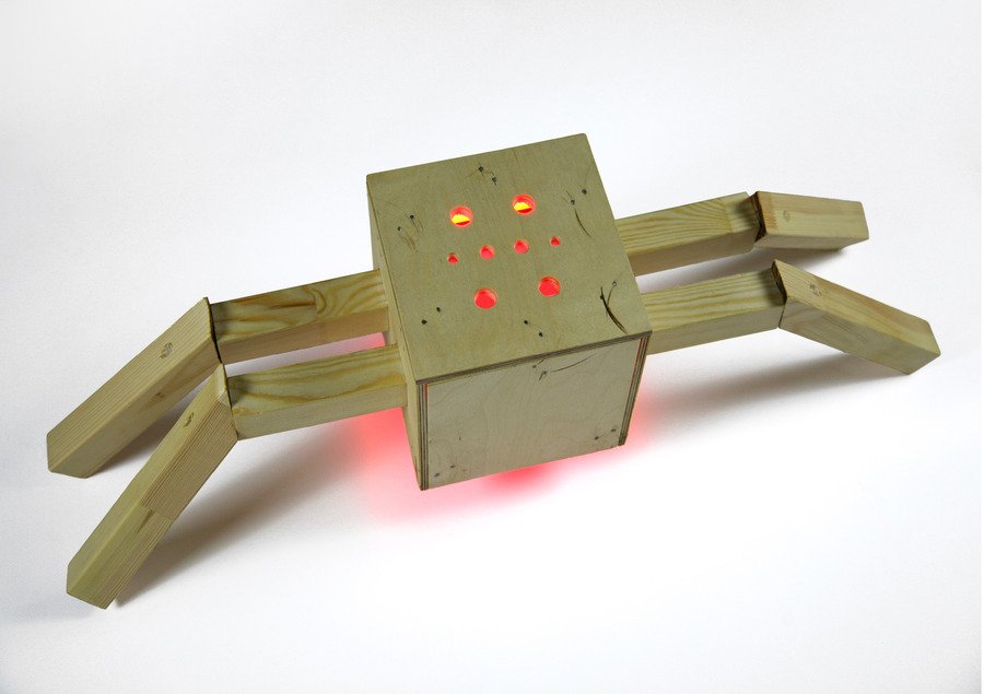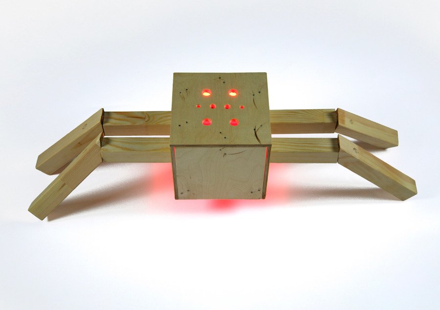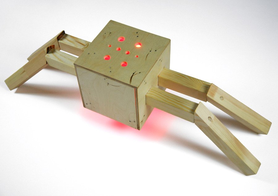 Через деревянное кубическое основание проходят ноги, являющиеся опорой предмета, благодаря чему паук как бы левитирует над полом и оставляет световой рефлекс. В него встроена rgb-лампа, которая может менять цвет в зависимости от настроения.