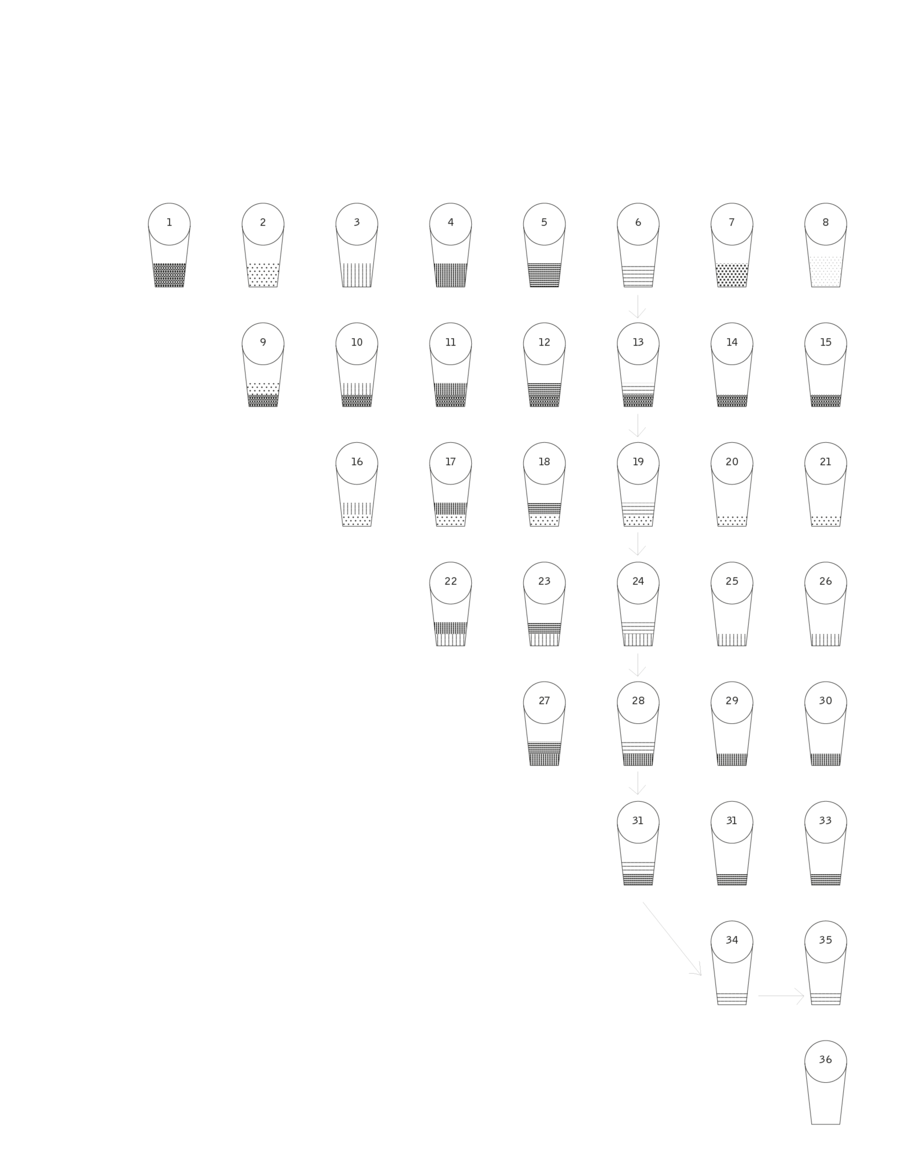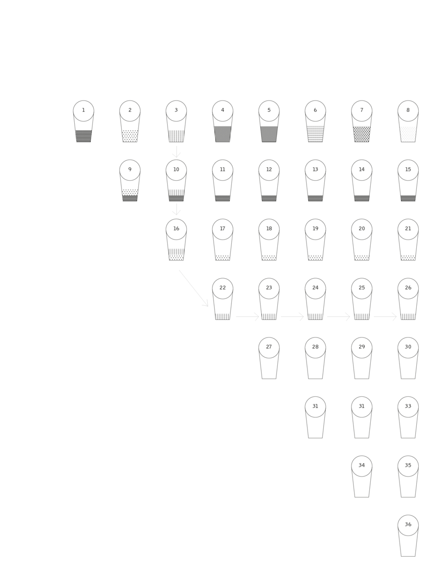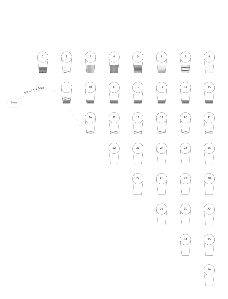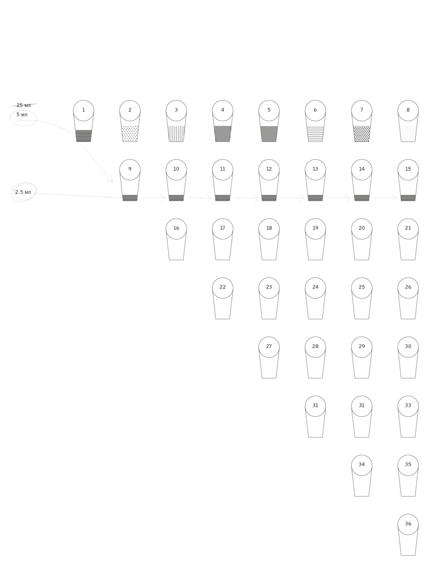 На иллюстрации ниже изображены стаканчики, где есть оксид Хрома. Получается на каждую базу + красящий оксид приходится по 8 стаканчиков, причемв стаканчике из которого берется суспензия, должно остаться 5 мл.