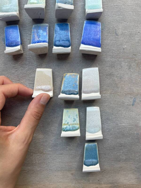 Используя данный метод, можно создавать огромное кол-во цветовых откликов, изменяя базу или процентное соотношение красящих веществ. Всё зависит от замысла автора. Если глазурь предназначена для пищевой посуды, то пробники необходимо проверить на лимонный или уксусный тест.