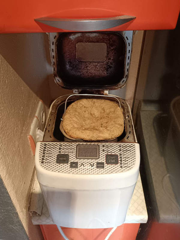 В случае если вы делаете в хлебопечке, то необходимо добавить все ингредиенты в последовательности, как указано в инструкции к хлебопечке. Обычно это сначала вода, потом дополнительные ингредиенты, потом мука, потом дрожи — ингредиенты выше указаны в этой последовательности. После чего запустить стандартный режим хлебопечки на 3 часа.
