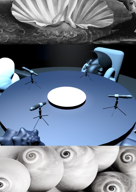 Камера делает круг вокруг башни сверху и снизу, спускаясь к столу, где вокруг сидят раковины. К каждой приставлен микрофон. Камера фокусируется на каждой из них по очереди, пока из раковины доносится промт из списка.