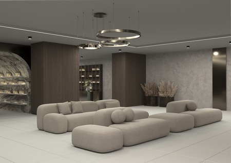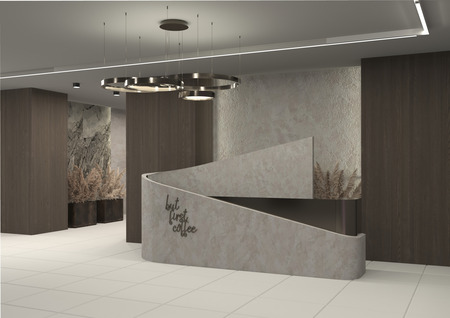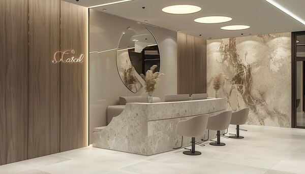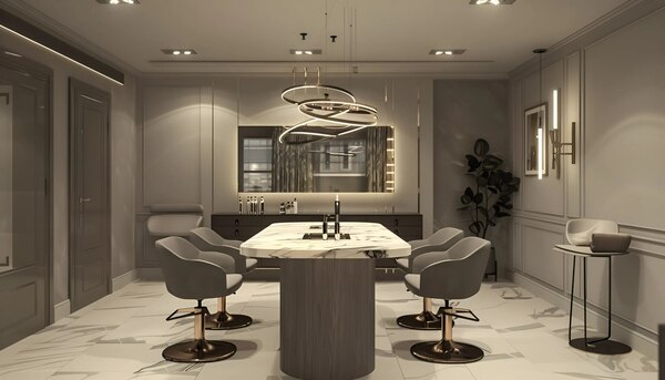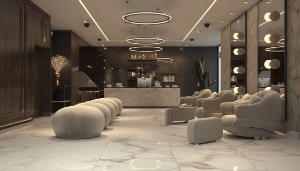 Given picture is interior of lobby in beauty salon. Make this picture more cinematic and realistic please --ar 7:4