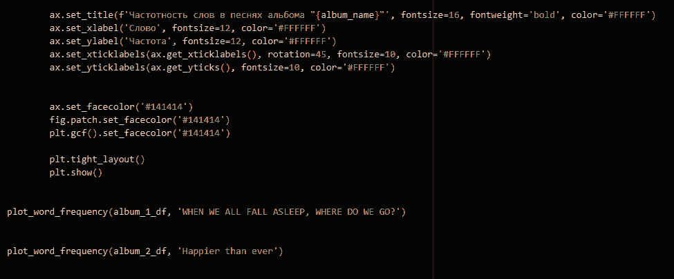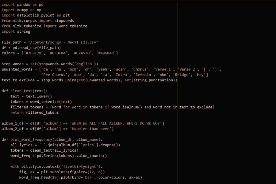 Интересно было проследить, как меняется частота использования слова «love» в двух альбомах Billie Eilish. Для этого я снова обратилась к гистограммам. Результаты показали, что в более позднем альбоме слово «love» встречается чаще, особенно в песне «My Future», посвященной ее будущему. Это может свидетельствовать о сдвиге в тематике ее творчества, возможно, связанном с взрослением, новыми отношениями или изменением мировоззрения. Разница в частоте использования слова «love» между альбомами подчеркивает эволюцию артистки и может указывать на более оптимистичный и позитивный взгляд на жизнь в более позднем периоде творчества.