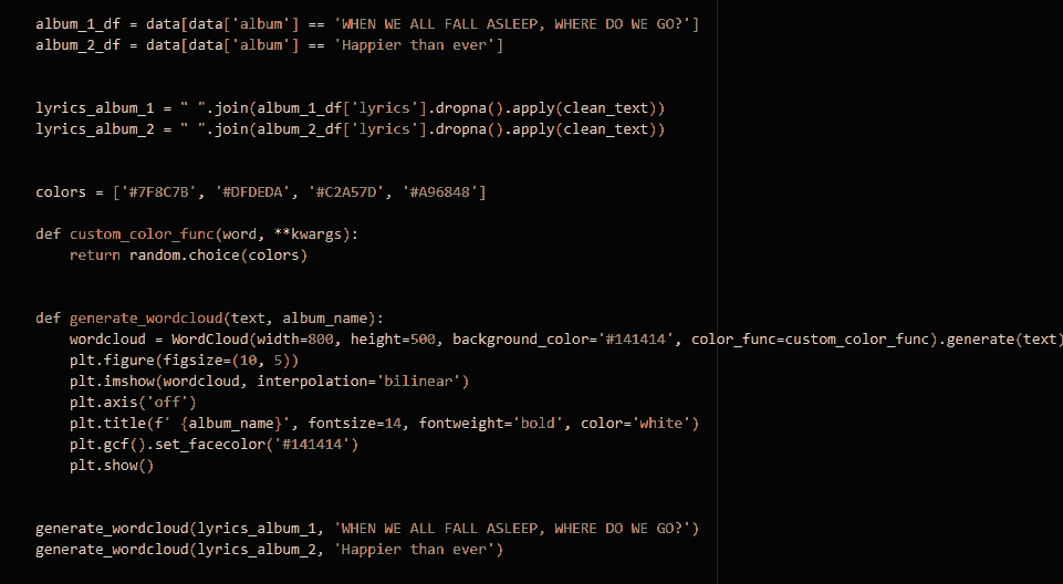 Для более глубокого анализа текстов песен, я создала облака слов для каждого альбома, визуализируя частоту встречаемости различных слов. Это позволило выявить интересные различия в лексике Billie Eilish. В альбоме «WHEN WE FALL ASLEEP, WHERE DO WE GO?» доминируют слова, связанные с негативными эмоциями и неуверенностью: «say», «sorry», «feel», «never», «nothing». Они отражают возможное эмоциональное состояние артистки в тот период.