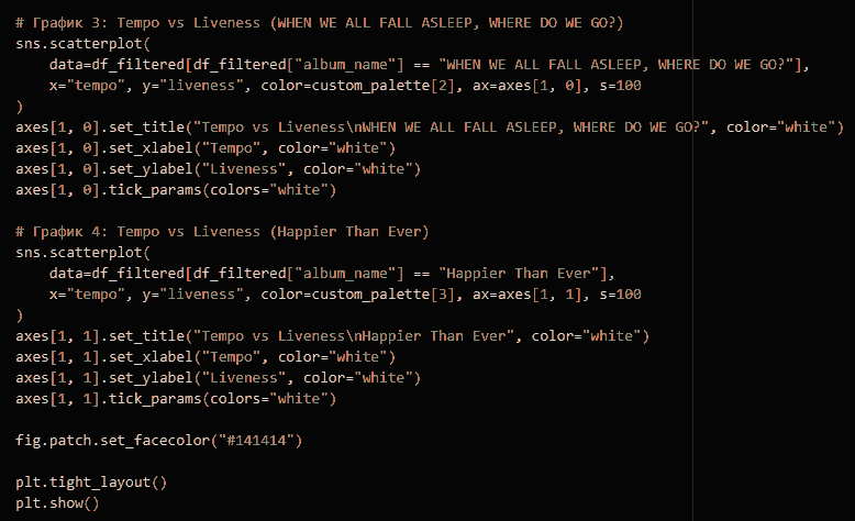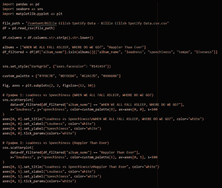 Билли Айлиш — мой любимый артист с самого начала ее карьеры, и ее творчество всегда восхищало меня своей уникальностью. В этом исследовании было интересно глубже погрузиться в ее музыку, увидеть эволюцию звучания и эмоций в двух альбомах. Анализ показал, как менялся ее стиль, настроение песен и подход к созданию музыки. Это позволило взглянуть на ее творчество с новой стороны и еще больше оценить глубину и искренность ее искусства.