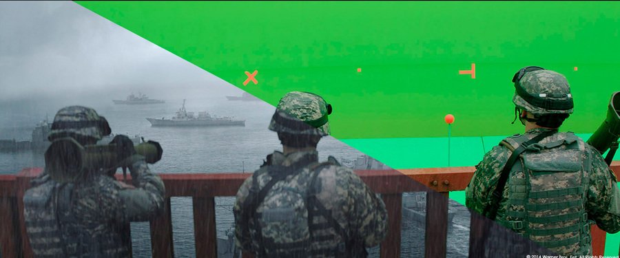 Сравнение кадра из фильма «Годзилла», 1998 и кадра с закулисных сьемок с использованием хромакея.