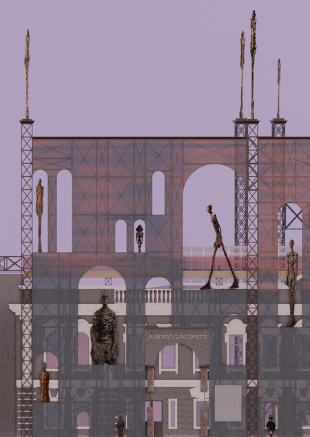 Временный фасад Российской Академии Художеств основан на пугающем и одновременно завораживающем творчестве Альберто Джакометти, которое удивляет своей тонкостью и смыслом, вложенным в каждую скульптуру. Передача характера художника реализуется через видеопроектор, а также через полупрозрачную конструкцию, увековеченную творениями самого Джакометти.