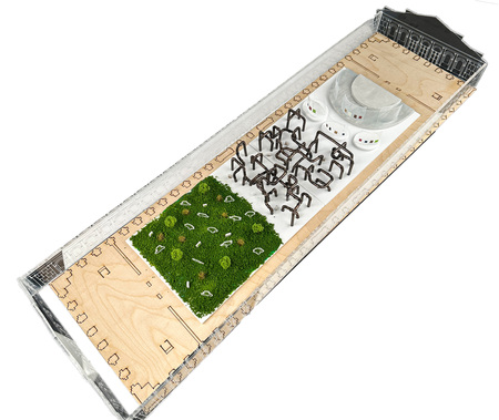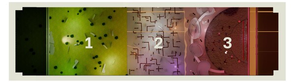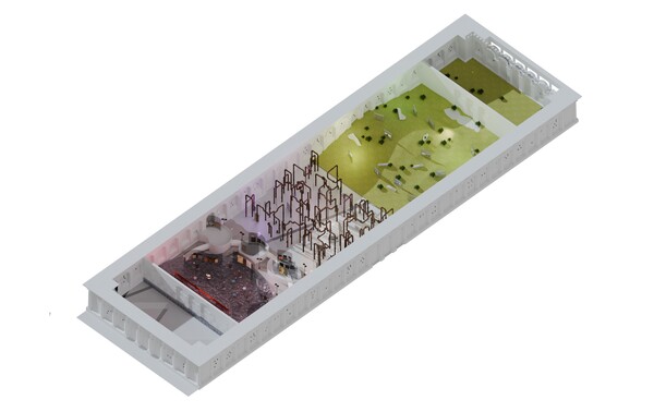 1. Парковая зона, которая представляет ранние работы периода импрессионизма. 2. Фабричное помещение, передающее настроение антропоморфных чертежей. 3. Кабаре отражает известные прозрачные картины художника, которые наполнены глубокой чувственностью.