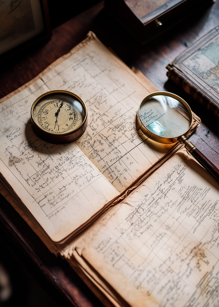 Close-up interior photo. Resting on a dark walnut console table below is an open antique journal, its aged pages filled with hand-drawn sketches of clocks and cryptic notes written in elegant, faded ink. Beside it, a small crystal magnifying glass with a brass handle lies atop a folded map with frayed edges.