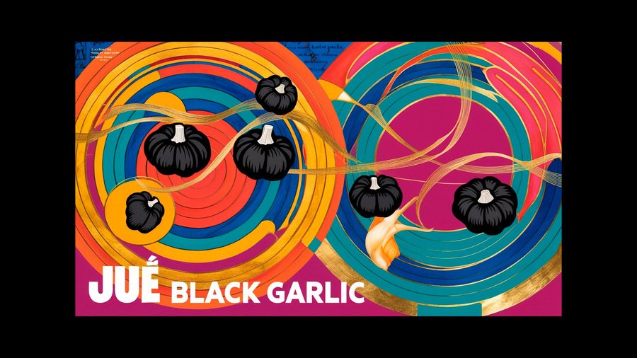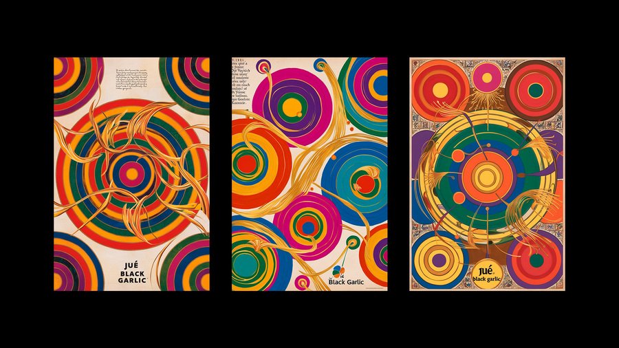 /imagine prompt: create poster features a vibrant, abstract design with multiple concentric circles on the Voynich Manuscript style in different bright rich colors. Interspersed among these circles are stylized on the Voynich Manuscript style with a dynamic, flowing appearance Delicate golden lines weave through the composition, adding a sense of connection and movement. There is also text present at the top, and the word «Jué Black Garlic» at the bottom.