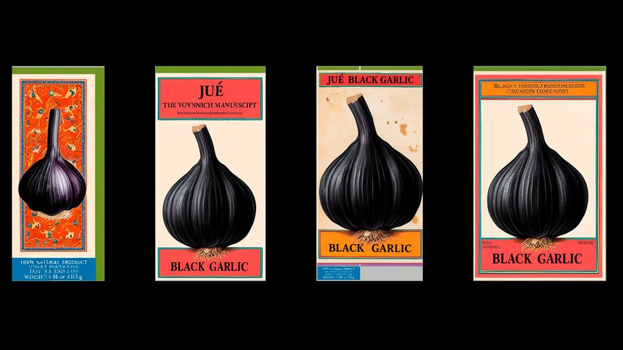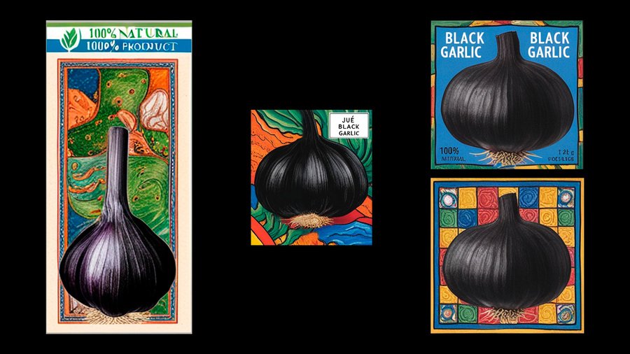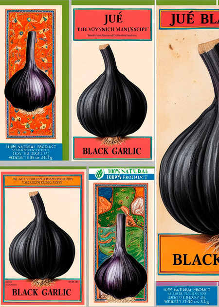 6-7) /imagine prompt: Create the image appears to be a design or layout for packaging or promotional material featuring black garlic. It is composed of several panels, each depicting a black garlic bulb in a the Voynich Manuscriptartistic style illustration. Some panels contain text English, including phrases like Jué Black Garlic along with other information such as 100% natural product and details about the weight and specifications. The overall artistic design uses a bright multicolored color scheme, focusing on the texture and shape of the garlic bulbs the style of the Voynich Manuscript