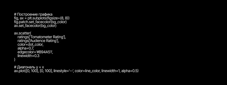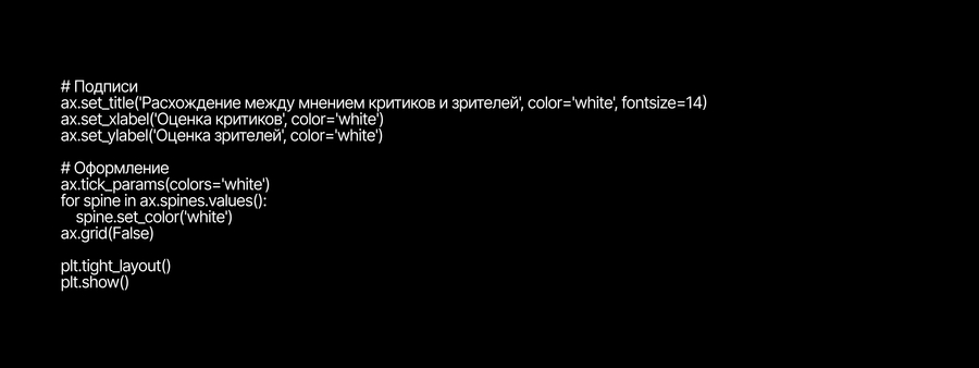 Для анализа расхождения оценок критиков и зрителей в качестве типа визуализации выбрана диаграмма рассеяния для более наглядной визуализации отличия мнений.