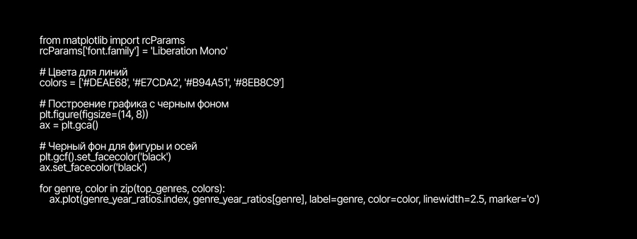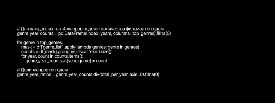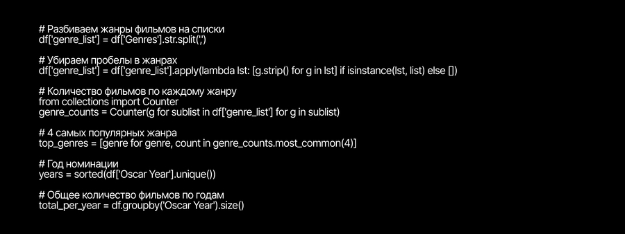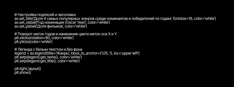 Для анализа и визуализации доли самых популярных жанров среди номинантов и победителей премии была выбрана линейная диаграмма для лучшего отображения динамики 4 самых популярных жанров фильмов.