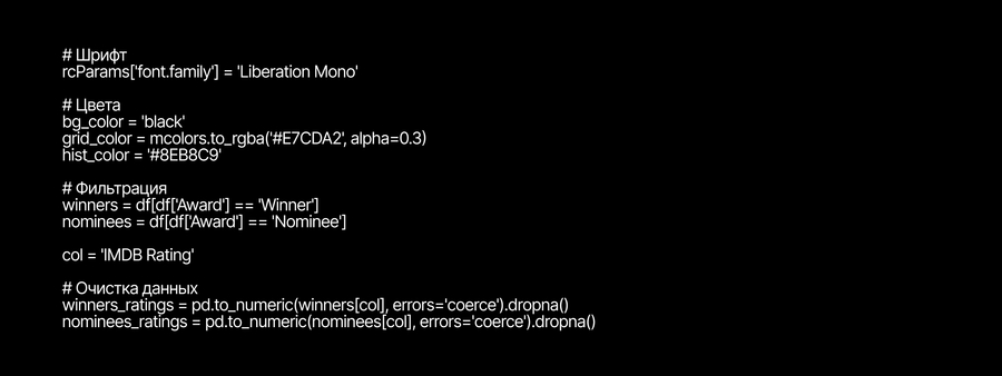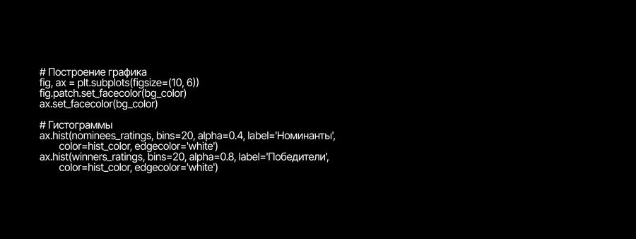 Для визуализации распределения рейтингов IMDB победителей и номинантов премии в качестве типа визуализации была выбрана гистограмма для наиболее наглядного сравнения оценок.