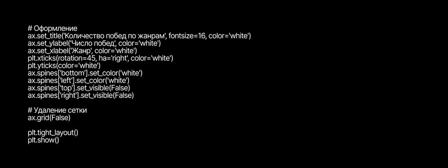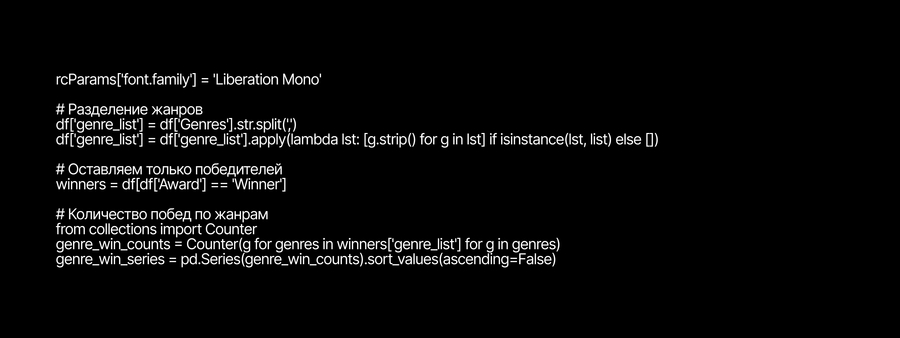 На данной диаграмме визуализирована зависимость жанра фильма от количества побед на премии. Можно сделать вывод, что жанр Драма является самым частым победителем премии, насчитывая более 70 побед, в то время как фильмы жанров Хоррор и Арт-хаус не насчитывают даже 10 побед.
