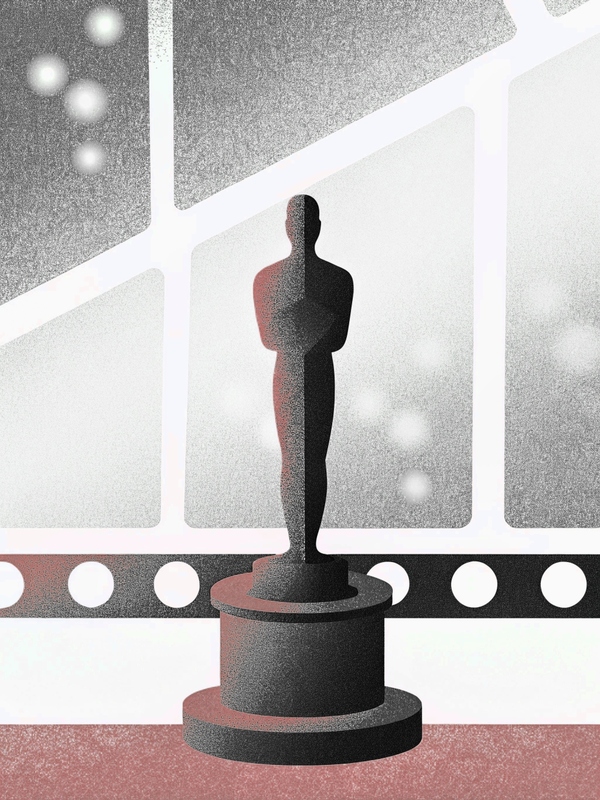 Использованные промпты: black and white illustration, Oscar statuette, blurry lights background, grainy effect, cinema theme