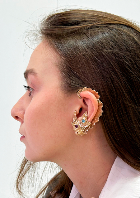 Таким образом, в изделиях заложен смысл расцвета внутренних сил человека, его стремление к прекрасному, а отражено это при помощи разноцветных камней: топаза, хризолита, родалита. Изделия выполнены из бронзы с мятой текстурой, что отражает пройденный путь человека с его взлетами и падениями.