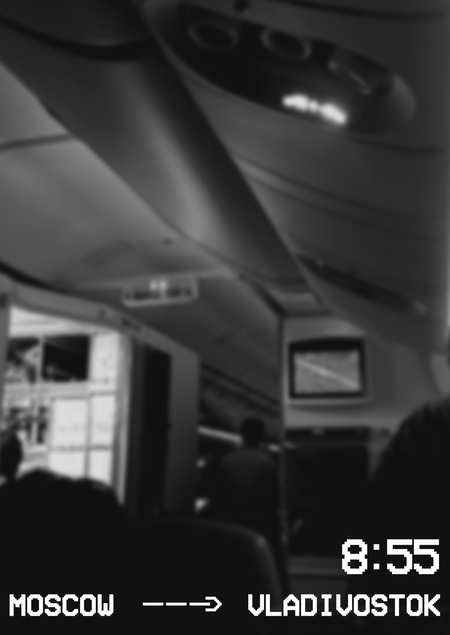 8:55 — это серия фотографий с нуар-фильтром, где я, каждый раз просыпаясь, каждый час своего перелёта запечатлял абсолютно случайный кадр без какой-либо подготовки на камеру мобильного телефона. Нуар-фильтр — моё настроение, а 8:55 — время полёта из Москвы во Владивосток