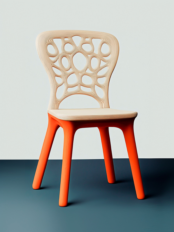 Стул «Вологда» представляет собой современное прочтение традиционного вологодского кружева, выполненного в виде резного узора на спинке стула. Этот предмет мебели сочетает в себе природные материалы, такие как дуб, и инновационные методы производства, такие как 3D-печать. Оранжевые ножки стула добавляют яркий акцент, контрастируя с натуральной текстурой дерева. Стул подчёркивает идею сохранения природы через использование переработанных материалов и традиционные ремёсла, предлагая новую роскошь, основанную на уважении к культурному наследию и экологии. Промт Midjourney: A dining chair from the wood oak 3D printed with orange legs. The backrest is made of circles cut out from natural oak wood with Vologda laces pattern. A frontal view product design photograph on a grey background without shadows in a front perspective with studio lighting. A high resolution, hyper realistic and detailed textures 3D render using Octane render in the style of a product shot. Separate floor — Deep navy blue floor --ar 3:4 --v 6.1 (Для достижения наилучшего результата было проведено множество итераций с частичным редактированием участков и перекомпоновкой изображения).