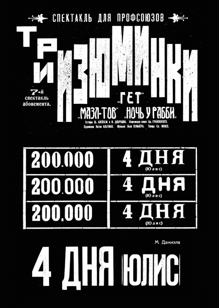 Выставка «От ГОСЕТа до „Шалома“, расположенная на входе в еврейский театр, призвана не только познакомить зрителя с историей сценического искусства, но и помочь ему настроиться на образный язык, погрузить его в мир, отличный от повседневности. Я рассматриваю эту выставку как своеобразный спектакль-инсталляцию, который предваряет собой главное событие вечера».