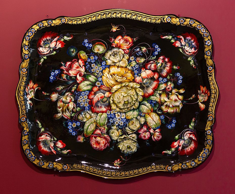 Давайте, например посмотрим, как связаны тагильская роспись по металлу, федоскинская миниатюра и Жостово. В 1775 году в селе Данилково купец Пётр Иванович Коробов основал мастерскую, выпускавшую лаковые козырьки и кивера из папье-маше. С изменением армейской формы потребность в таком продукте отпала, но Коробов к тому моменту посетил фабрику Иоганна Штобвассера в Брауншвейге, известную лакироваными табакерками, мебелью и предметами декора, и решил переквалифицировать производство под запросы рынка, производя шкатулки, портсигары и табакерки (нюханье табака как раз входит в моду, то есть товар пользуется спросом). Унаследовашие его дело московские купцы — отец и сын Лукутины — переносят промысел в Федоскино. А в 1825-м при лавке бывших крепостных Вишняковых, вхожих на федоскинскую фабрику (вот он, промышленный шпионаж!) открывается конкурирующая мастерская в Жостово. Для обеспечения конкурентноспособности Вишняковы ищут свое УТП (уникальное торговое предложение) и находят его! Образцом для подражания становится тагильская роспись металлических подносов, сформировавшаяся к середине XVIII века в Нижнем Тагиле и уже имеющая рынки сбыта. Сегодня мы сказали бы, что появилась ниша! В отличие от Федоскино, Нижний Тагил далеко от Москвы, а значит, и конкурировать с ним проще. Первое время Вишняковы работали и с металлом, и с папье-маше, но с 1839 года в указателе Всероссийской промышленной выставки упоминаются уже только жостовские металлические подносы… Мне очень нравится эта история преемственности с немного детективным уклоном!