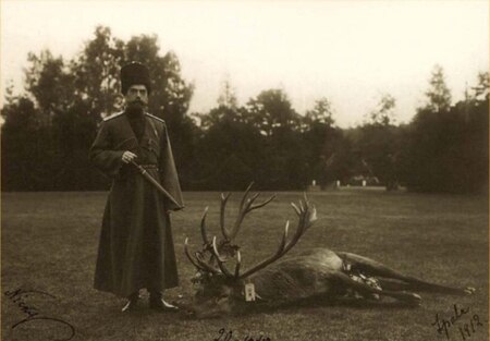 Царская семья на охоте 1890-е годы; Николай с подстреленным им оленем, 1912 г.