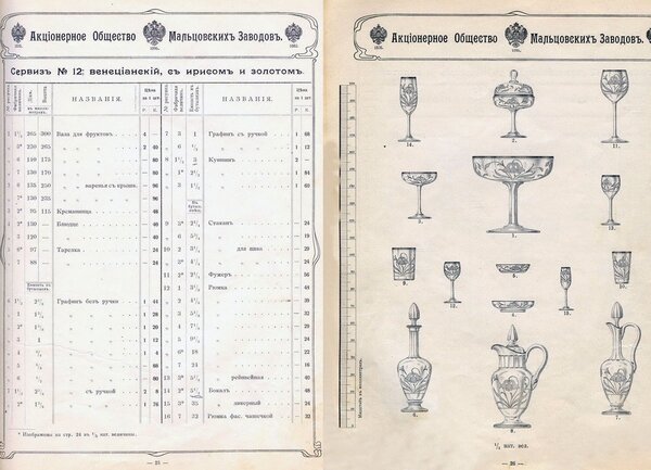 Предметы из сервиза «Венецианский, с ирисом и золотом»; прейскурант, начало ХХ века, Дятьковский хрустальный завод