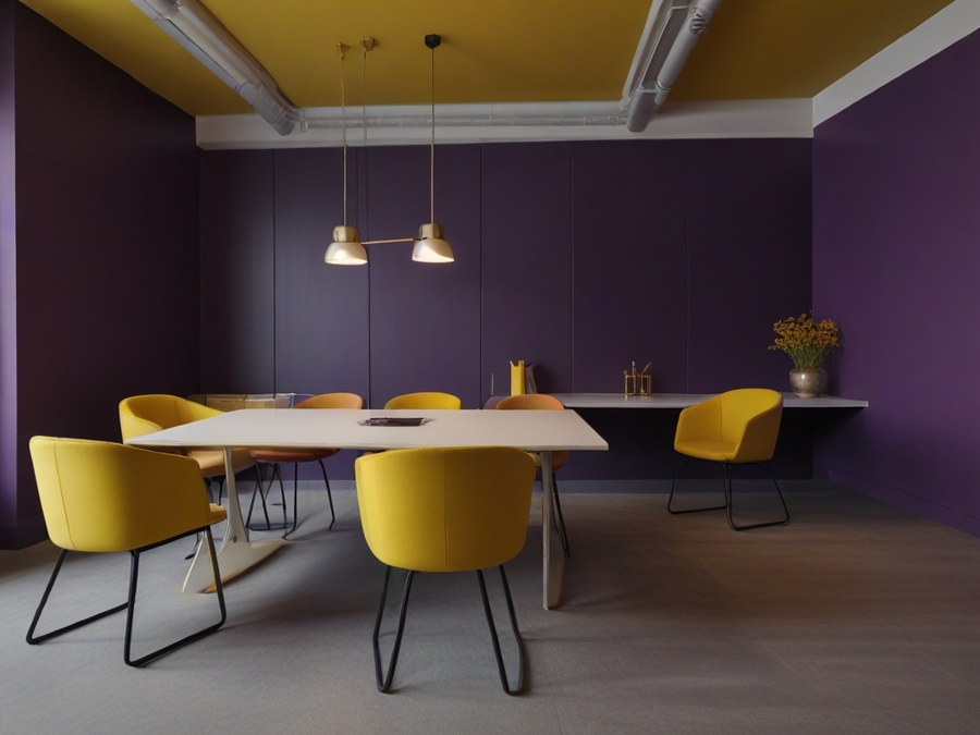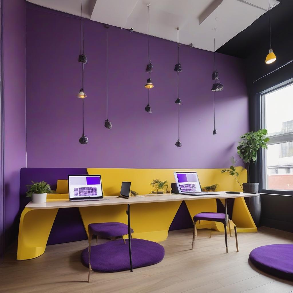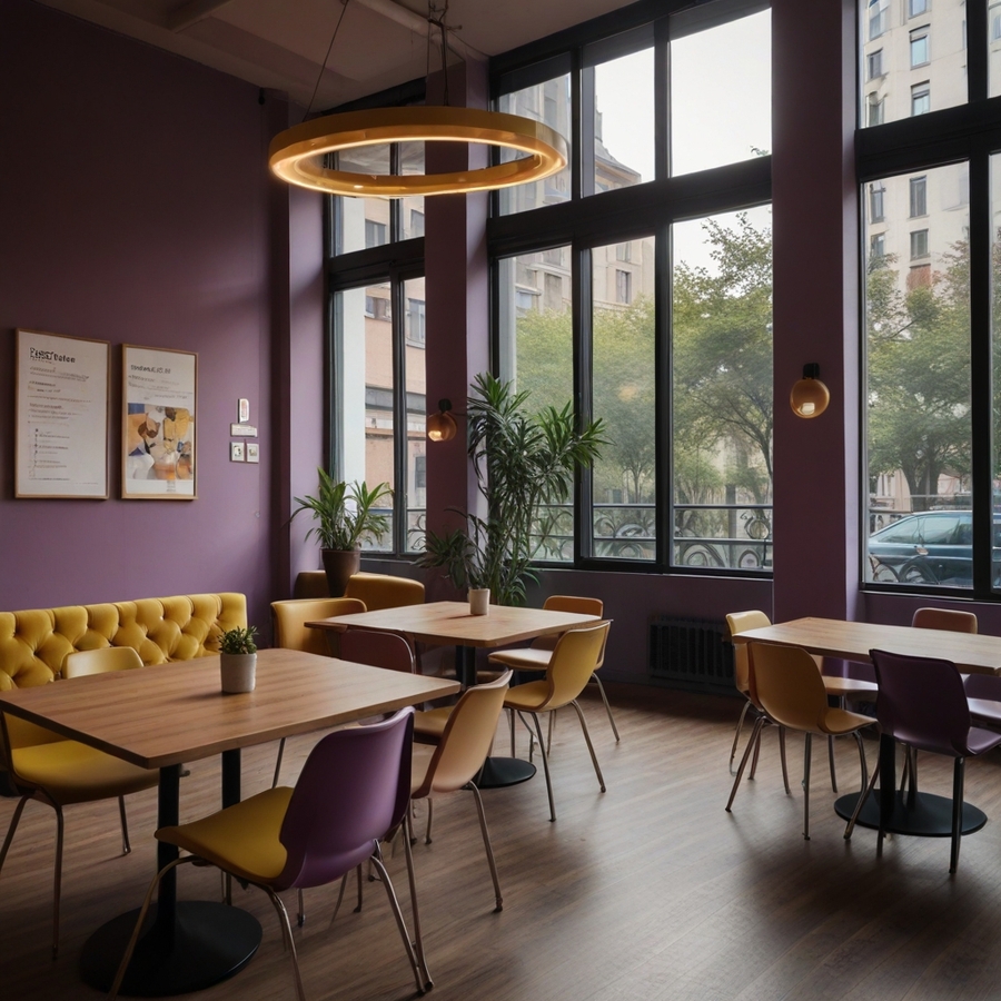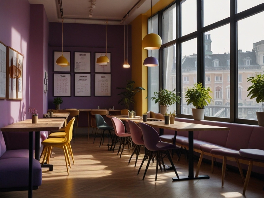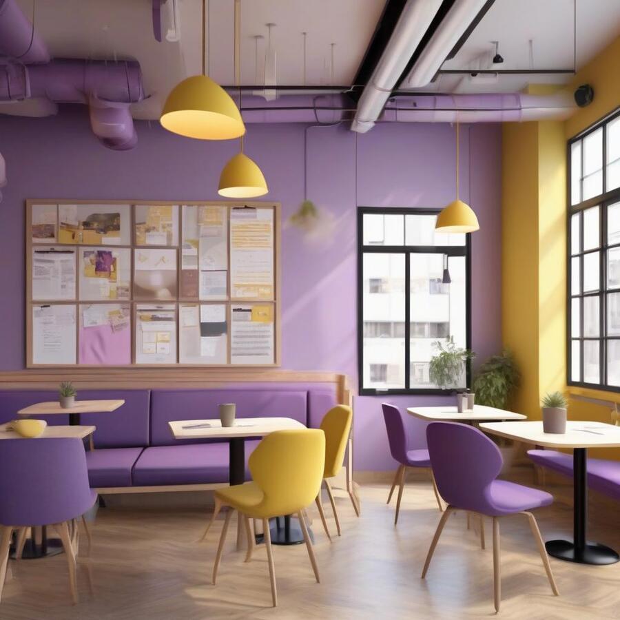 Промт: Create a photo of a calming and quiet atmosphere of a coworking area in a cafe. Highlight the big windows letting the rays of sunlight in and peaceful yellow and purple pastel tones to create an inviting environment for young adults trying to get work done. Emphasize the effective space for people working to reach their utmost productivity. Add subtle displays of motivational posters on the walls and snack trays in the background.