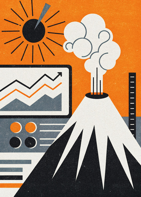 Промт: minimalist stylish volcano and charts, graphs and bars. Orange white and black colors