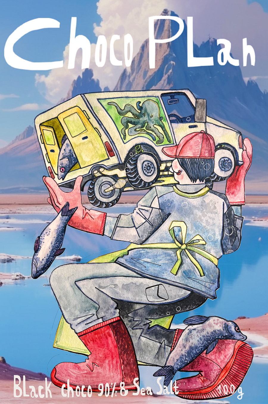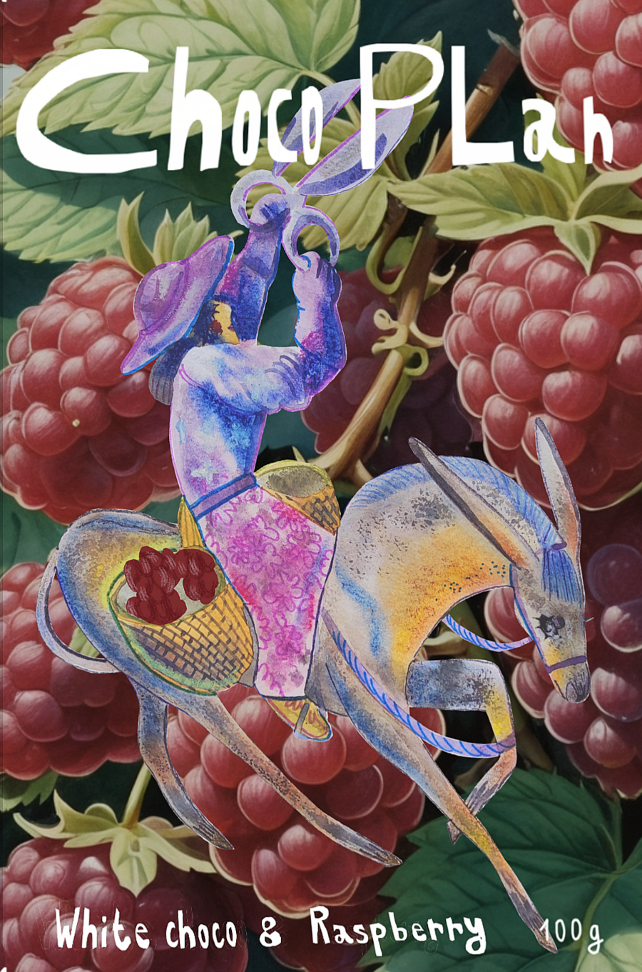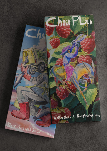«ChocoPlan» — шоколадные плитки из южноамериканского какао с начинками вдохновленными местными кондитерскими традициями. На упаковках белого шоколада с малиной, темного шоколада с солью и молочного шоколада с дульче де лече использованы иллюстрации совмещающие диджитал и ручную графику. Фоны с гиперболизированными наполнителями и людьми их добывающими воспевают ручной труд.