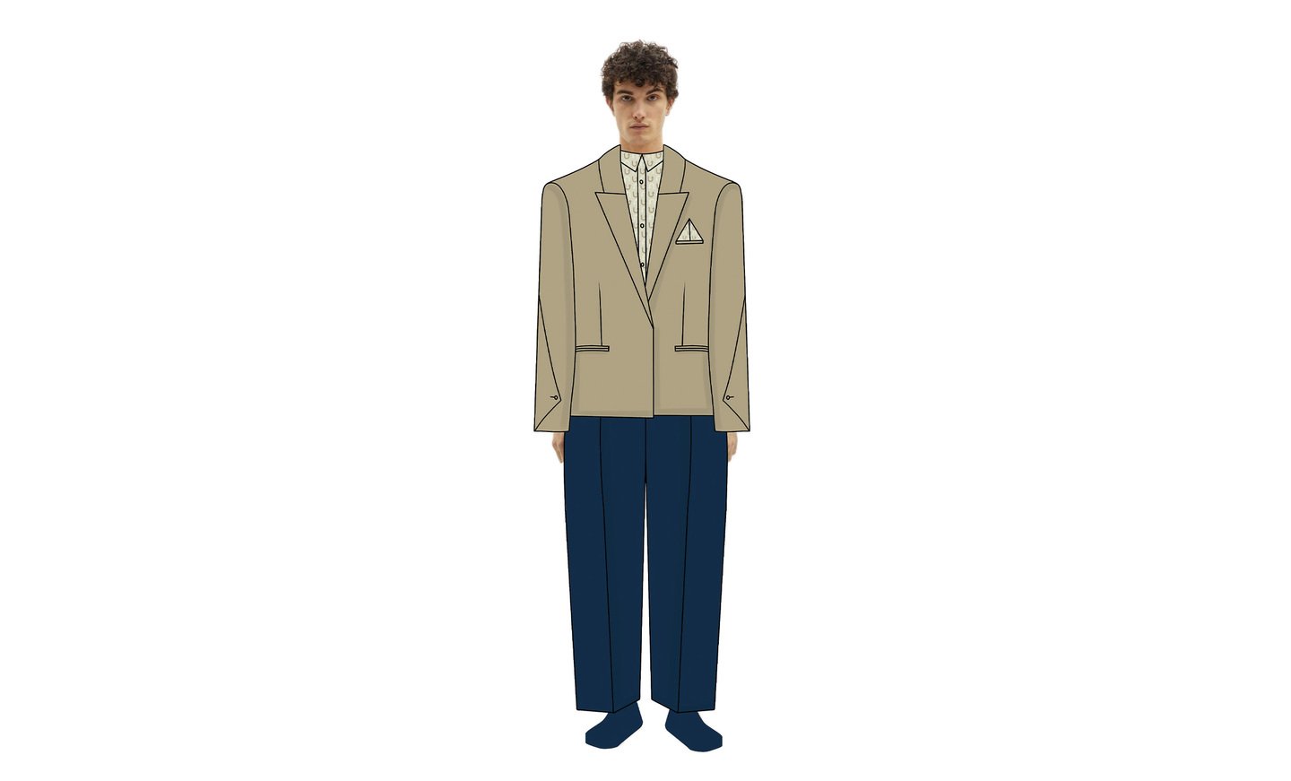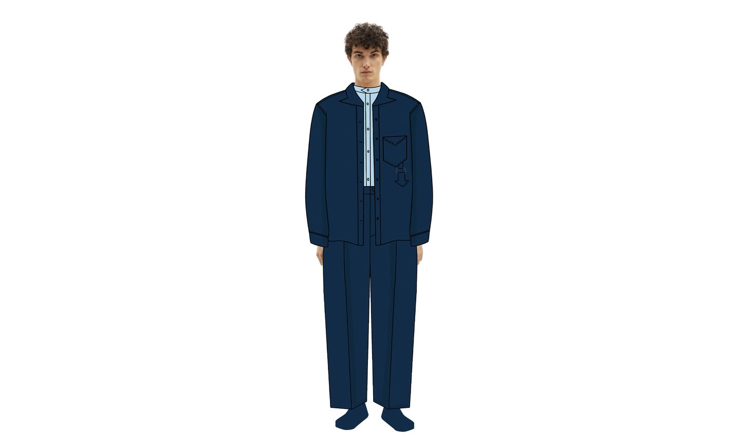Используемые ткани: Платок — шёлк Рубашка — натуральные ткани (хлопок, хлопок+шёлк) Брюки — тонкая костюмная шерсть Пиджак — тонкая костюмная шерсть, подкладка — 100% вискоза Металлический бейдж с нанесением имени