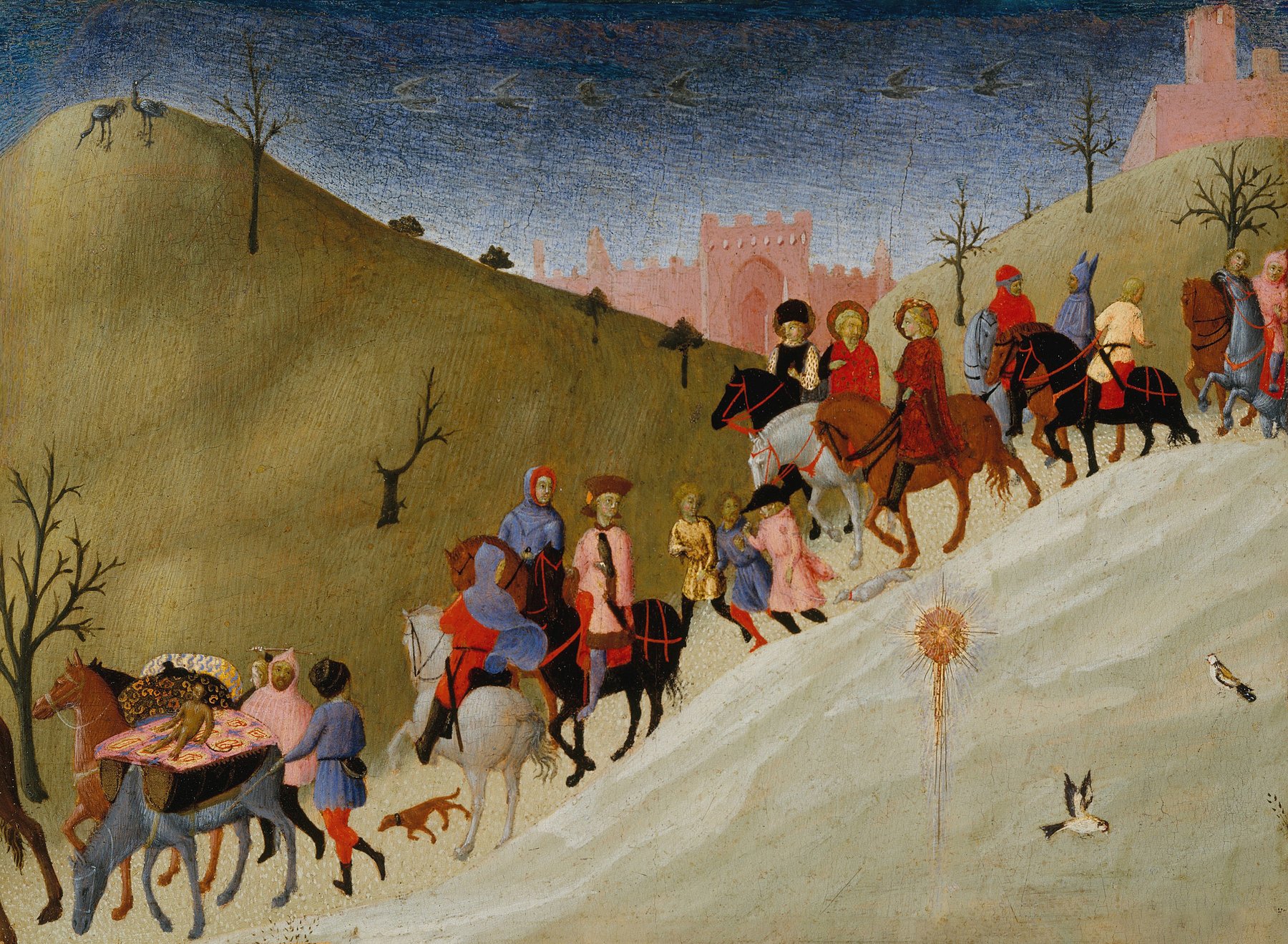 Стефано ди Джованни, более известный как Сассетта, — выдающийся художник эпохи Возрождения и одна из ключевых фигур сиенской школы. Его картина «Путешествие волхвов», написанная около 1433–1435 годов, изображает торжественное шествие трёх волхвов, следующих к младенцу Христу. Вифлеемская звезда, указывающая им путь, показана в необычном ракурсе — она словно парит между холмов, освещая процессию. В этой работе прослеживается влияние готической традиции, особенно в декоративности, характерной для сиенской живописи. Однако Сассетта также демонстрирует новаторский подход: стремление к объёму, глубине и реализму свидетельствует о переходе к ренессансным идеалам.