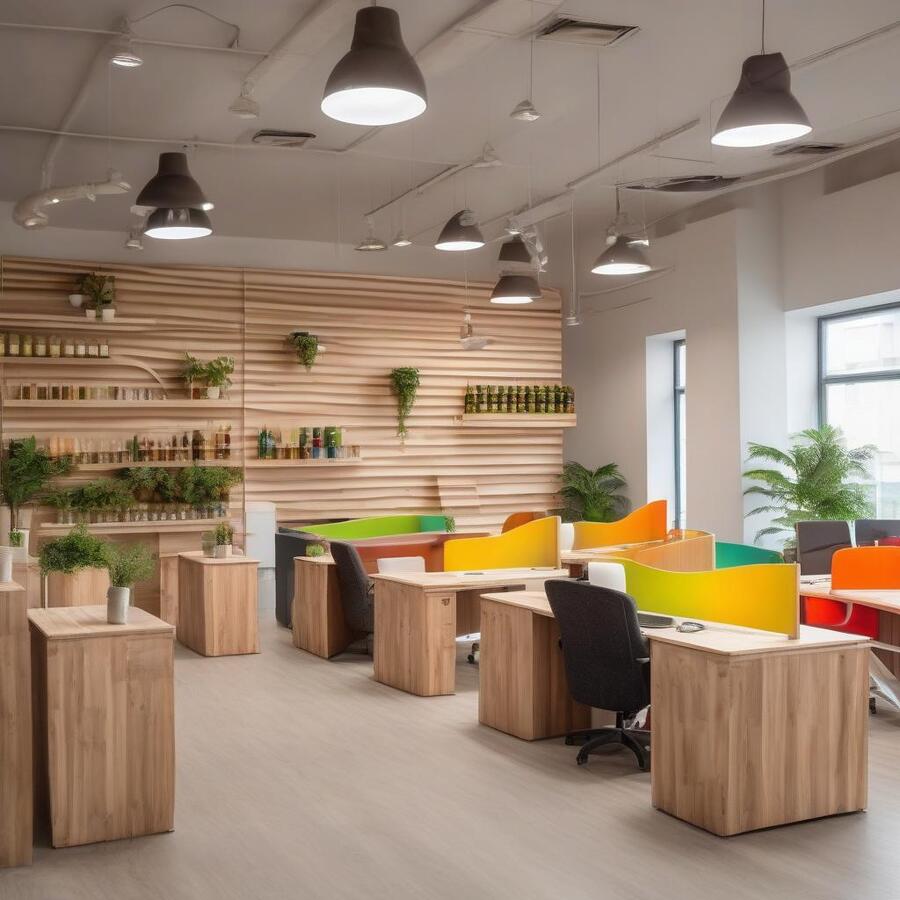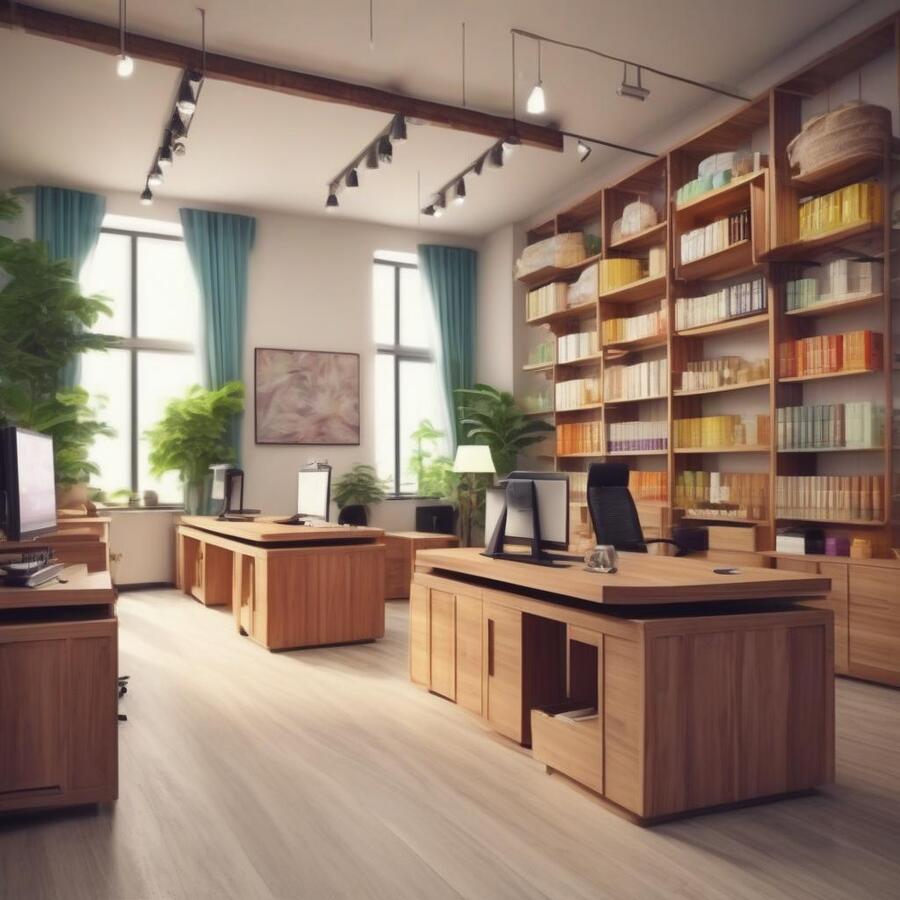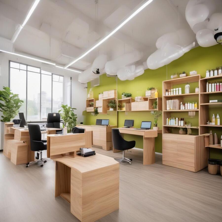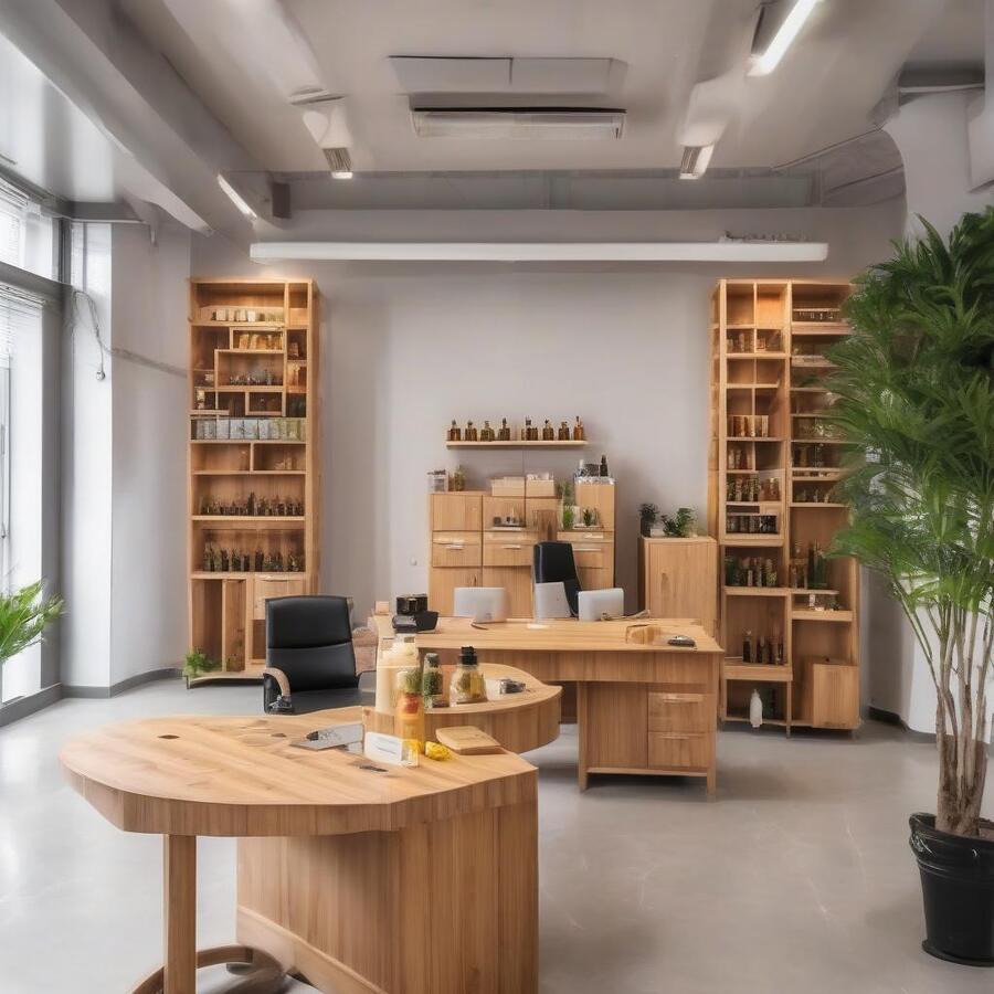 Промпт: the office of a company producing aroma oils with wooden furniture