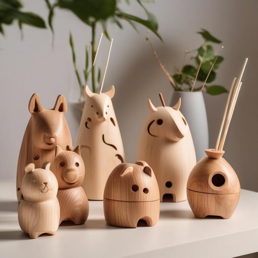 Варианты диффузоров однотонные. Промпт: wooden aroma oil diffusor in shapes of domestic animals