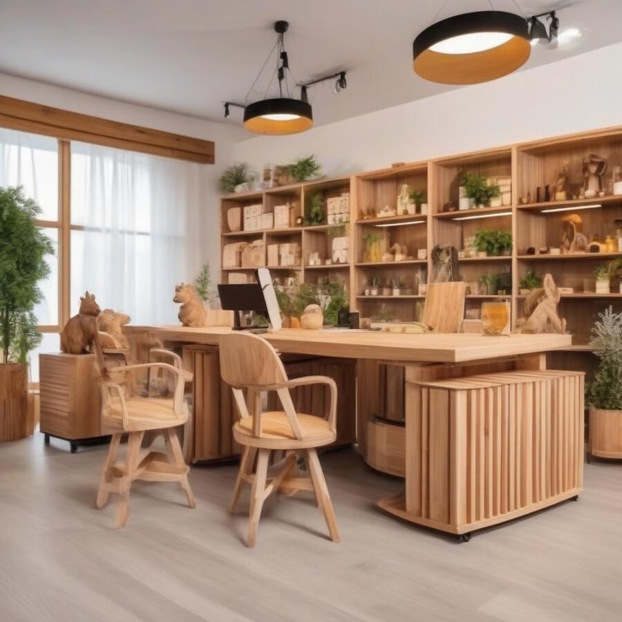Промпт: shopping corner in the shopping center for aroma oils wooden with wooden domestic animal figures