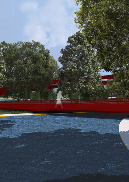 Парк является отражением уникального стиля футуризма, который Балла разрабатывал в своих работах. Основная архитектурная форма парка — это красный мост, напоминающий формы на картинах Баллы. Этот мост служит обзорной платформой, с которой открываются захватывающие виды на город и Неву, но и выступает в качестве центрального элемента паркового пространства, символизирующего движение.