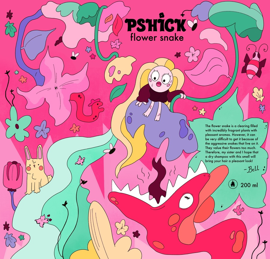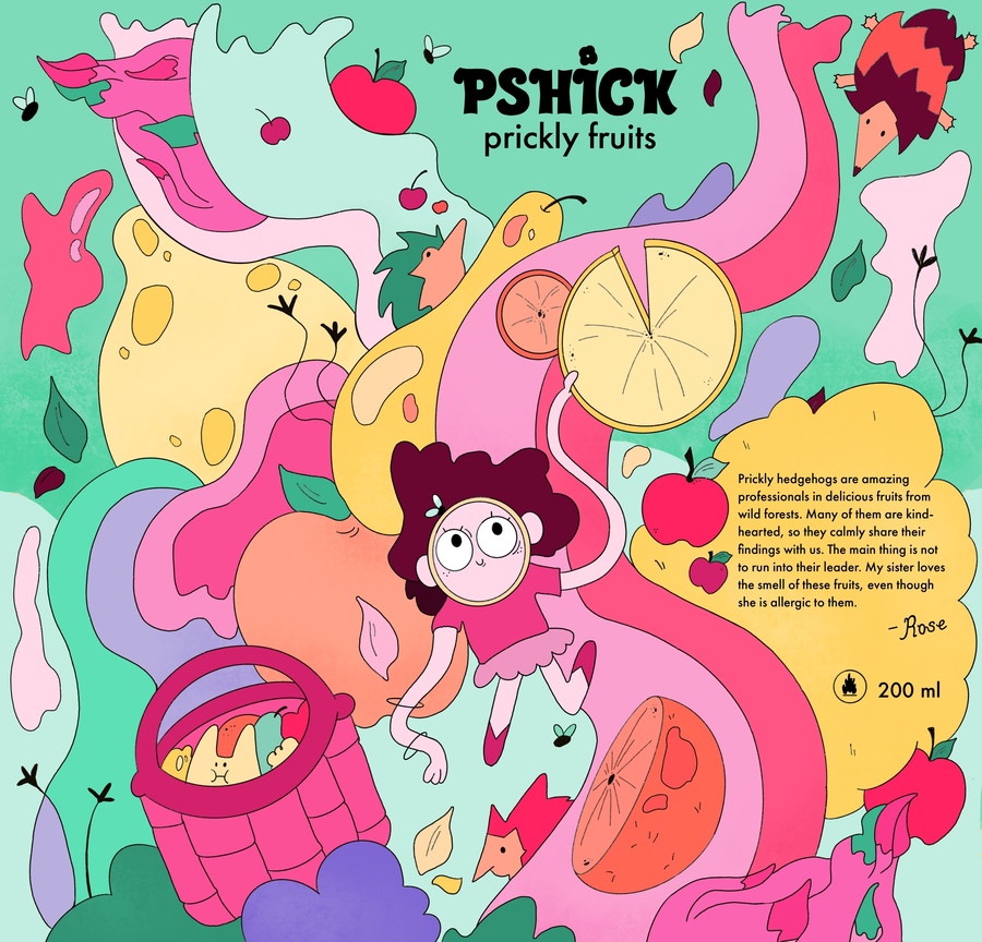 На каждой баночке шампуня оставлена небольшая история. Сестры и вонючка-волосатик рассказывают об их приключениях и особенностях сбора цветов и фруктов дикого леса.
