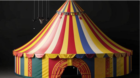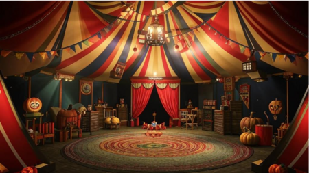Промпт: Внутренности шатра цирка. вид сверху. Хэллоуинская тематика. Яркие цвета.