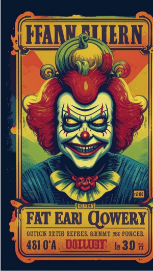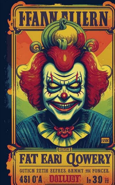 Промпт: Билет на хэллоуинский фестиваль. Добавить клоунов, яркие цвета. написать название «Fun Fear Clownery», написать дату «31 october».