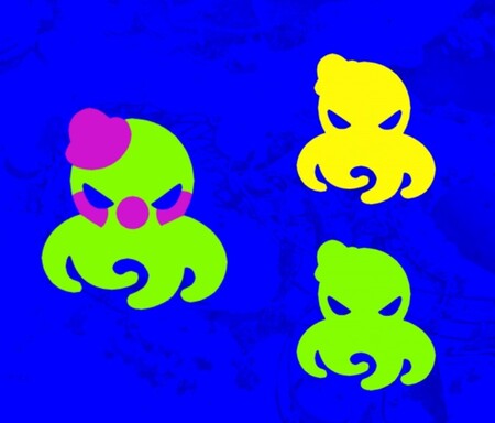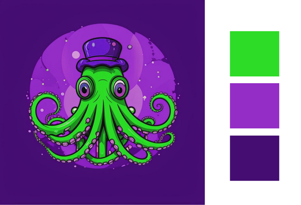 Промпт: Логотип в простом стиле. Осьминог с большой головой, ярко зеленового цвета с цилиндром на голове, выделенными щеками и носом клоуна фиолетового цвета.