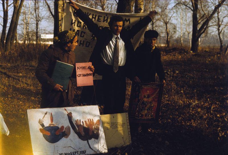 выставка «В аду» | акция Клуба Авангардистов (КЛАВА) в лесу в Орехово-Борисово, Москва, слева направо Ю. Альберт, Г. Абрамишвили, К. Звездочетов | документальные фотографии | 1987 [25-26]