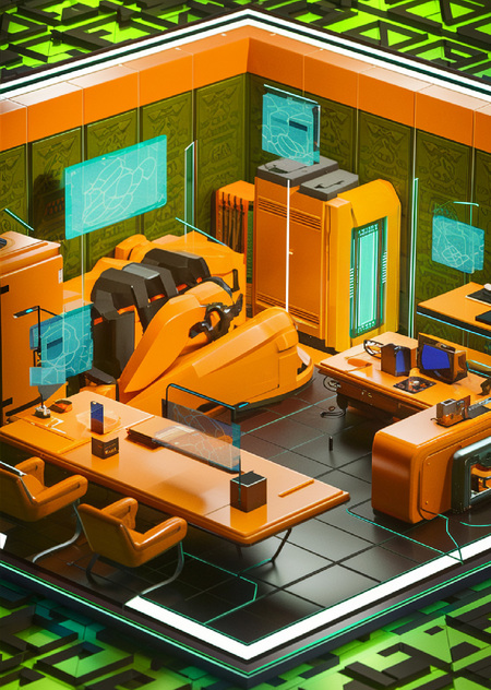 При создании изображений я использовала ключевые слова, такие как «футуризм» и «оранжево-зеленые цвета», чтобы поддерживать единый стиль всего проекта и гармонировать с оригинальным дизайном. Мне было важно через созданные образы передать атмосферу игры, сохраняя ее забавное сочетание серьезности офисной среды с идеей бунта недоделанных задач и незавершенных отчетов против сотрудников офиса.