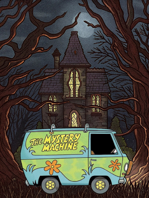 Draw an illustration in the classic Scooby-Doo cartoon style. Image: a gloomy, foggy landscape with an abandoned, gothic castle in the background. A translucent silhouette of a ghost can be seen in the window of the castle or hovering above it, adding to the mystique. In the foreground, in the center of the composition, stands the Mystery Machine, a bright blue van with distinctive green, orange and yellow psychedelic patterns and floral elements. The Mystery Machine logo should be clearly visible on the sides and back of the van. The van should be slightly illuminated, standing out against the gloomy landscape. The image is done in the style of the old Scooby-Doo comics: with thick black outlines, bright but muted colors for the landscape (to emphasize the gloominess) and rich colors for the van. The atmosphere should be mysterious and slightly sinister, but with recognizable cartoon elements.)