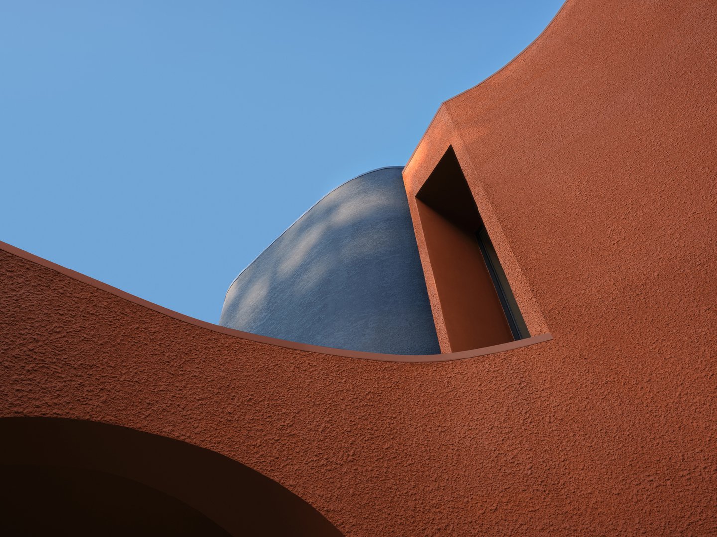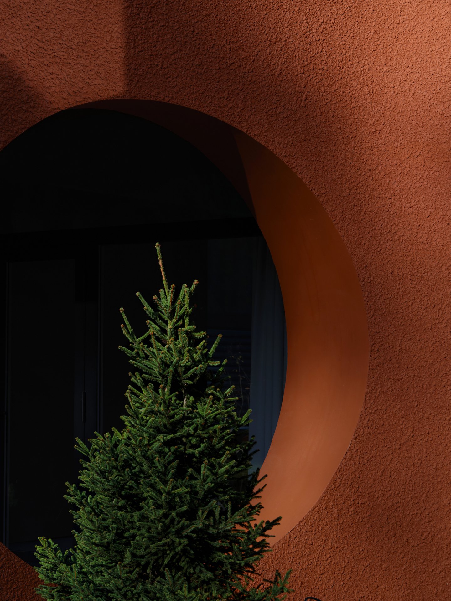 The next step was to lift the plan into volume, allowing the building’s form to respond to the placement of trees on the site. This process gave rise to two sculptural, animal-like forms — plaster-clad masses that intertwine in a complex yet organic way. A variety of window shapes and sizes brings a rhythm to the façade, making it lively and expressive.