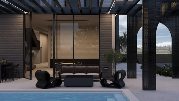 Две террасы гармонично вписаны в природный контекст. Одна из них интегрирована в зону гостиной и примыкает к бассейну, образуя уютное пространство с уличной кухней.
