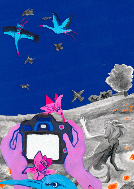 Иллюстрации, объединенные сочетанием черно-белой палитры и ярких цветовых пятен.